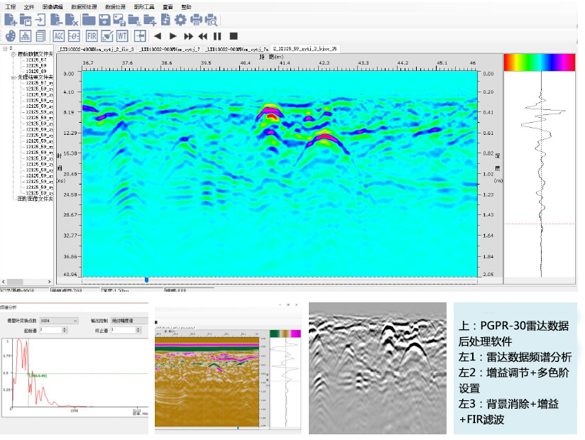 剖面翻轉、FIR濾波、極性翻轉、水平低通濾波、增益調節、道內滑動平均、地形校正、道內均衡、頻譜分析、道間均衡、數學運算、背景消除、圖像規范化、小波變換、道間重采樣、反褶積、零位校正、頻譜圖